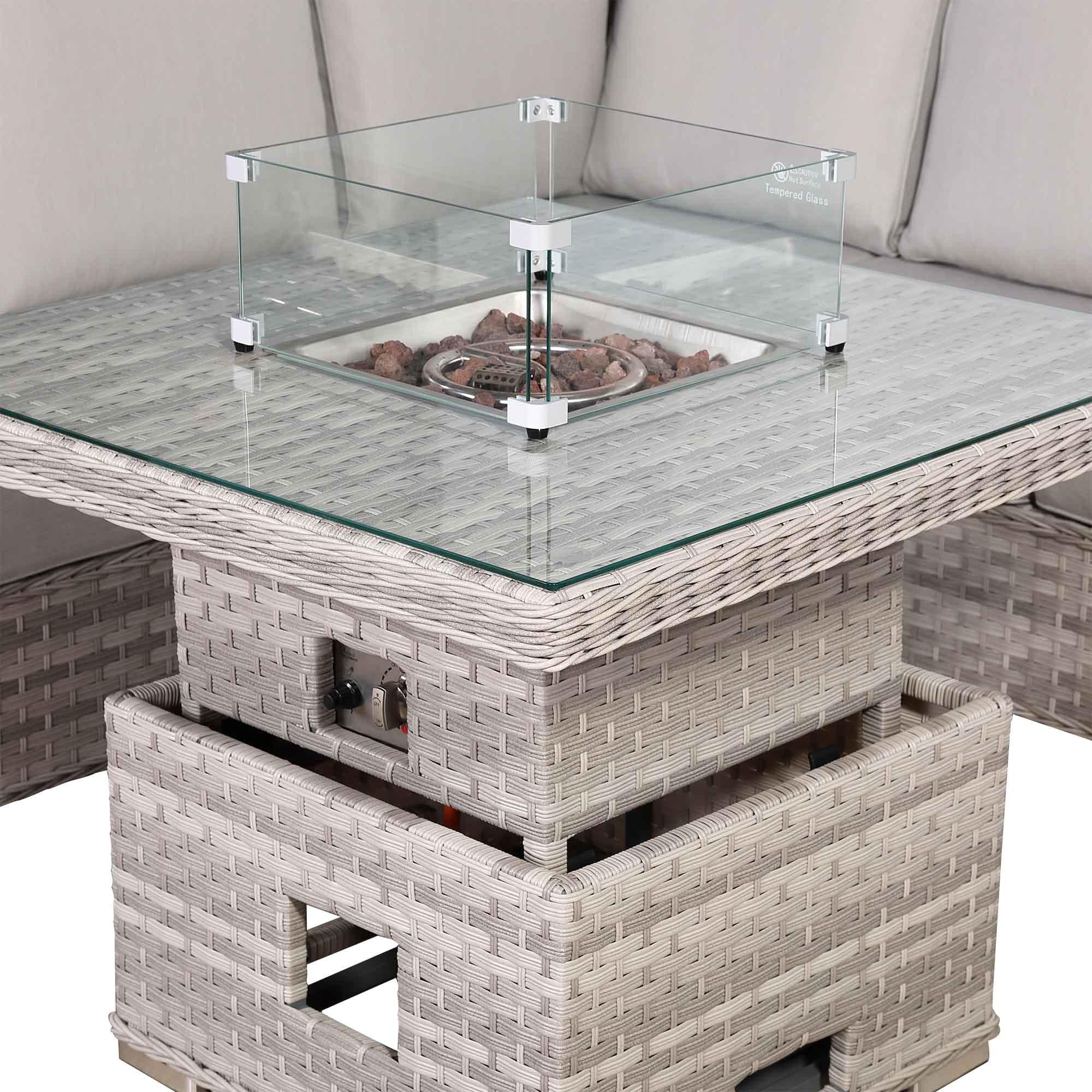 - Experience the perfect blend of a sleek glass tabletop and a built-in fire pit