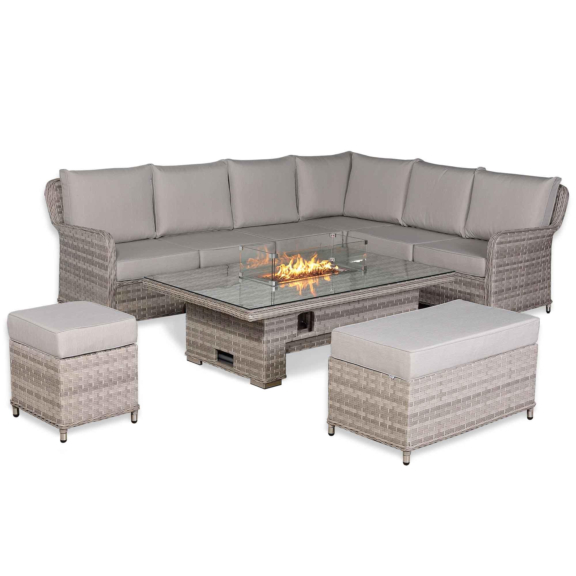 Havana outdoor sofa set with a fire pit creates a warm and atmospheric centerpiece. Its adjustable, weather-resistant table is both practical and durable, perfect for relaxing or entertaining in your garden or patio.