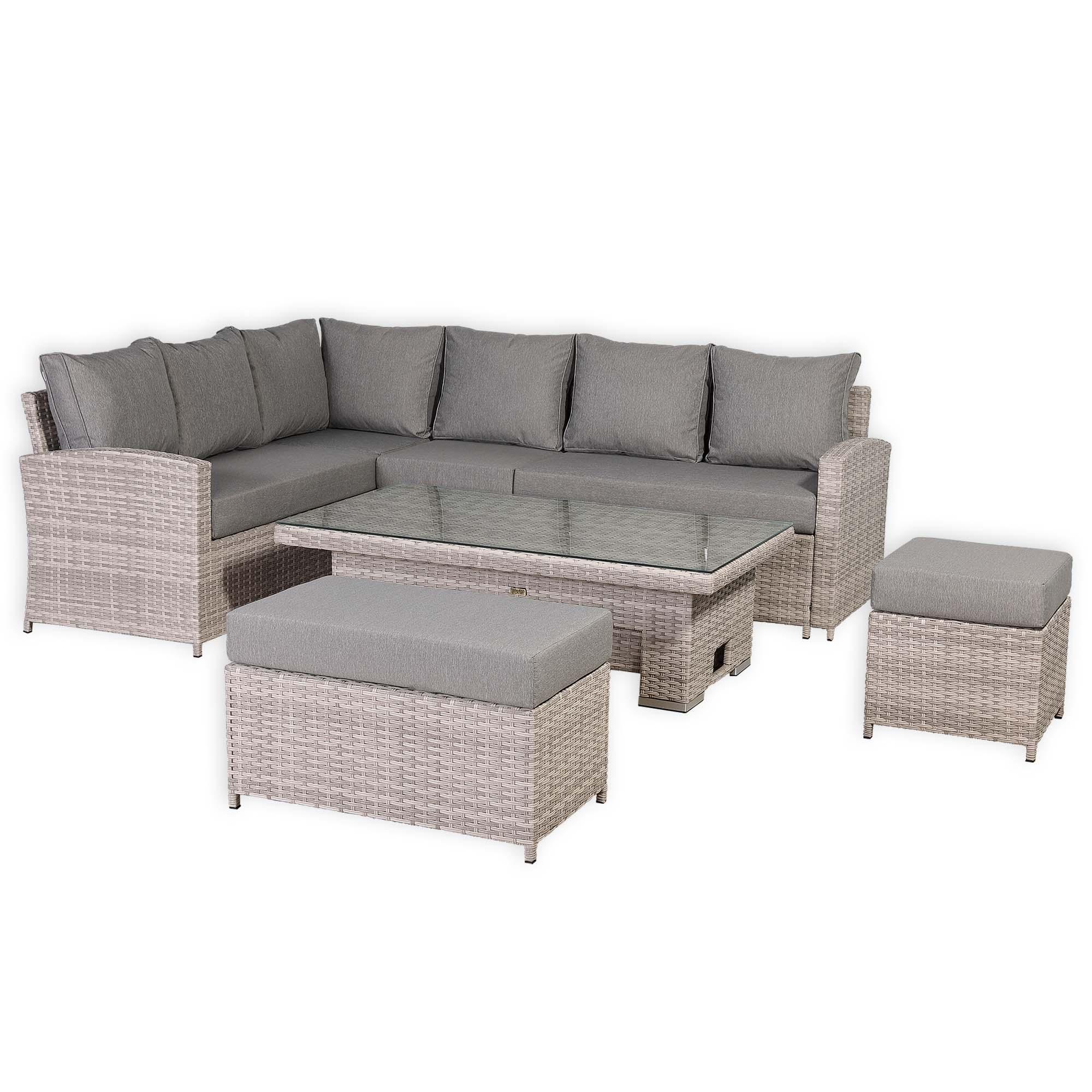 - This set features a spacious adjustable table which adjusts effortlessly, adapting to casual coffee mornings or elegant al fresco dining