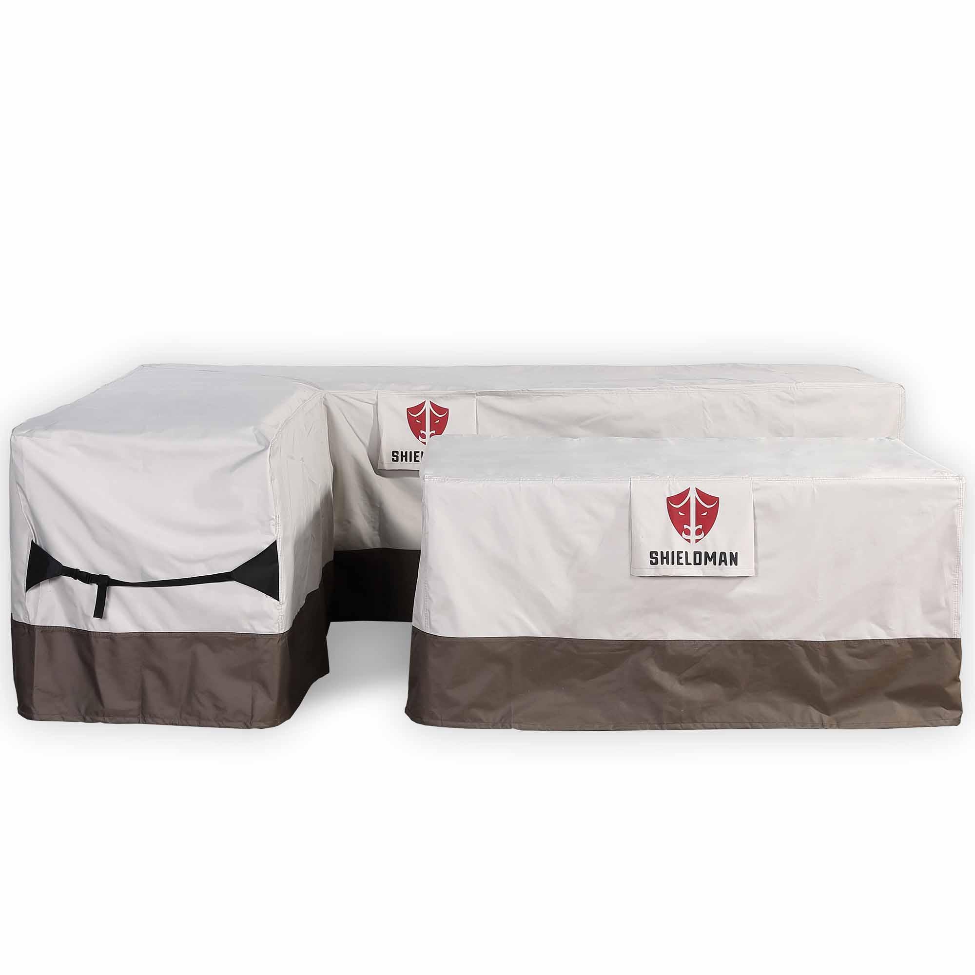 Each set comes with 2 covers to individually cover the corner sofa and the dining table. Over winter, the stools fit neatly on their side on each of the sofa sections underneath the covers.