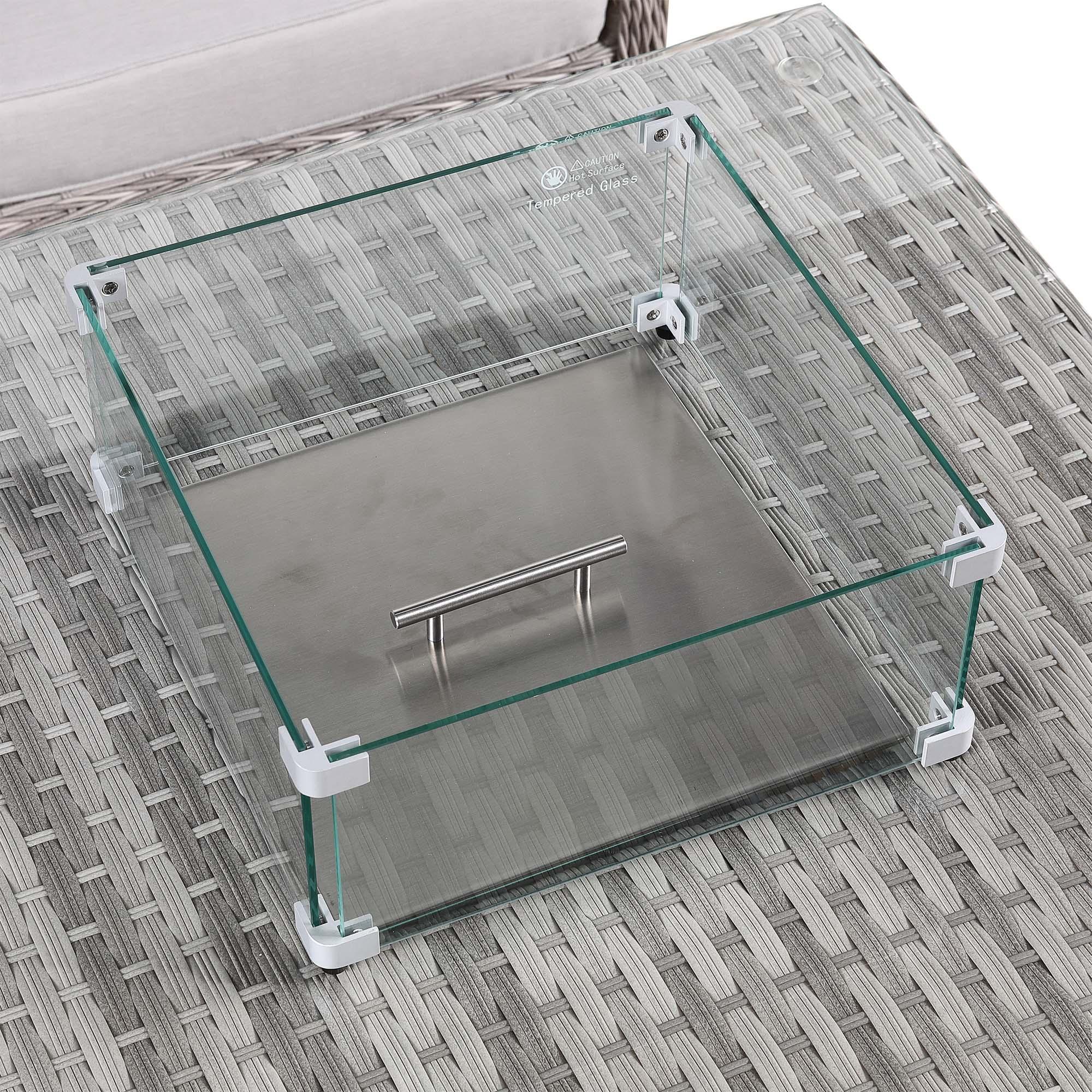 - Experience the perfect blend of a sleek glass tabletop and a built-in fire pit