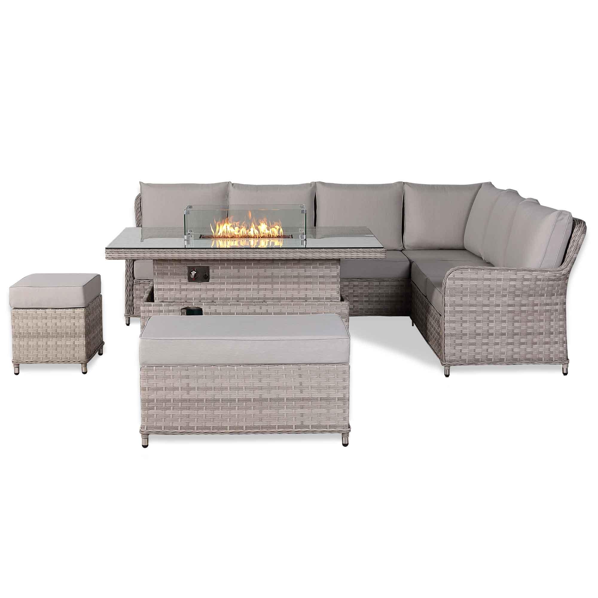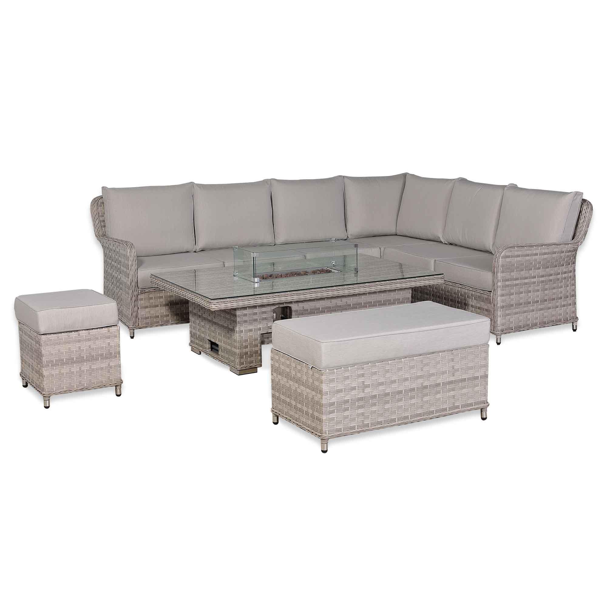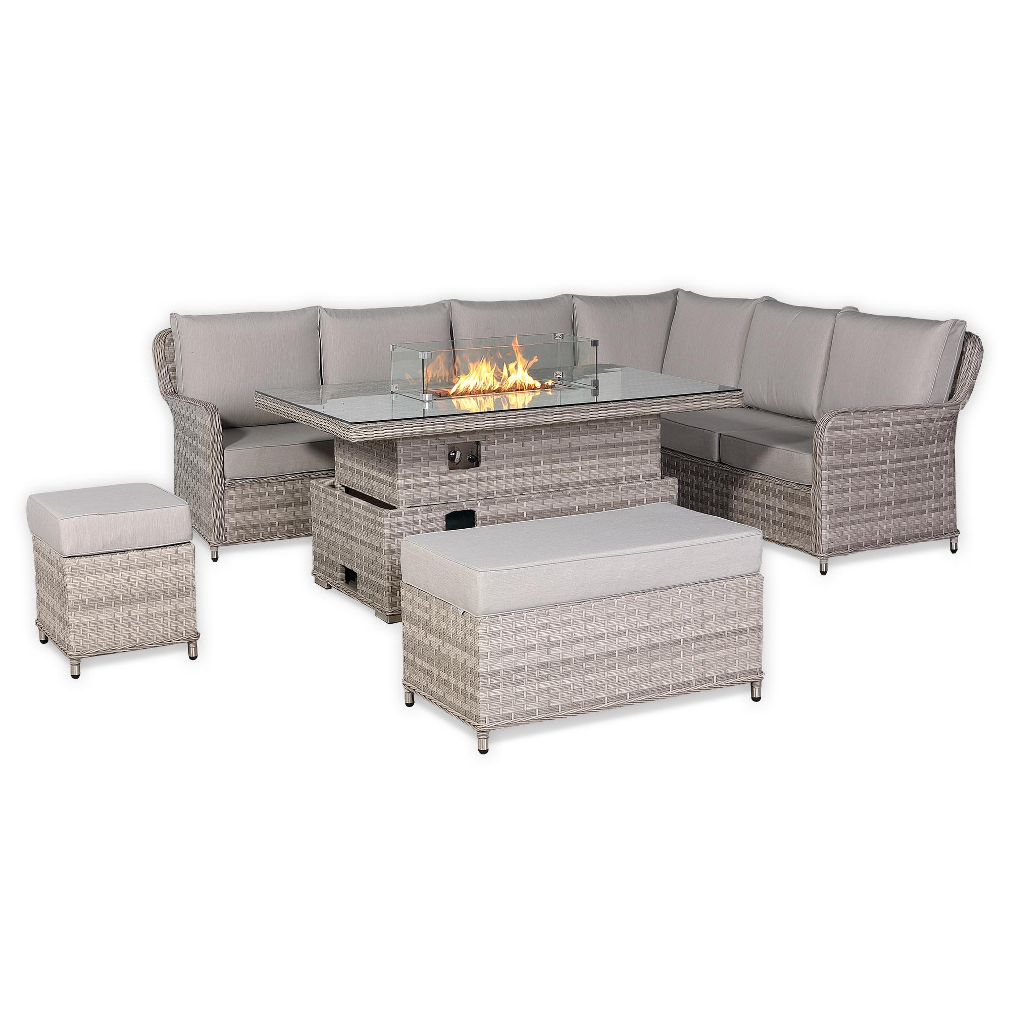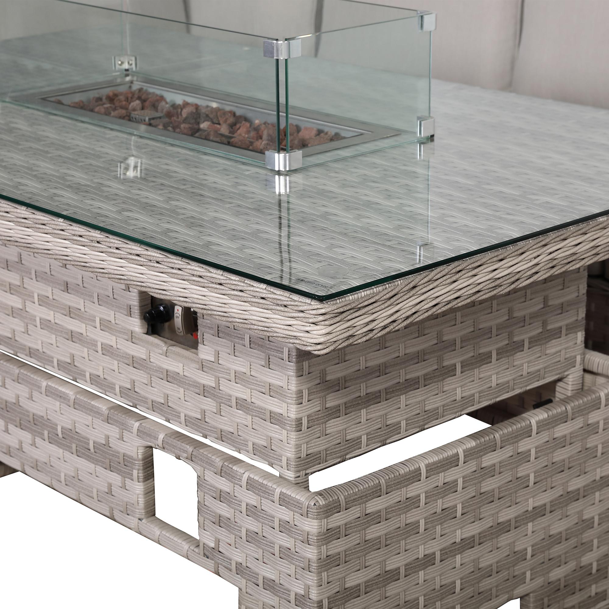 Havana outdoor sofa set with a fire pit creates a warm and atmospheric centerpiece. Its adjustable, weather-resistant table is both practical and durable, perfect for relaxing or entertaining in your garden or patio.