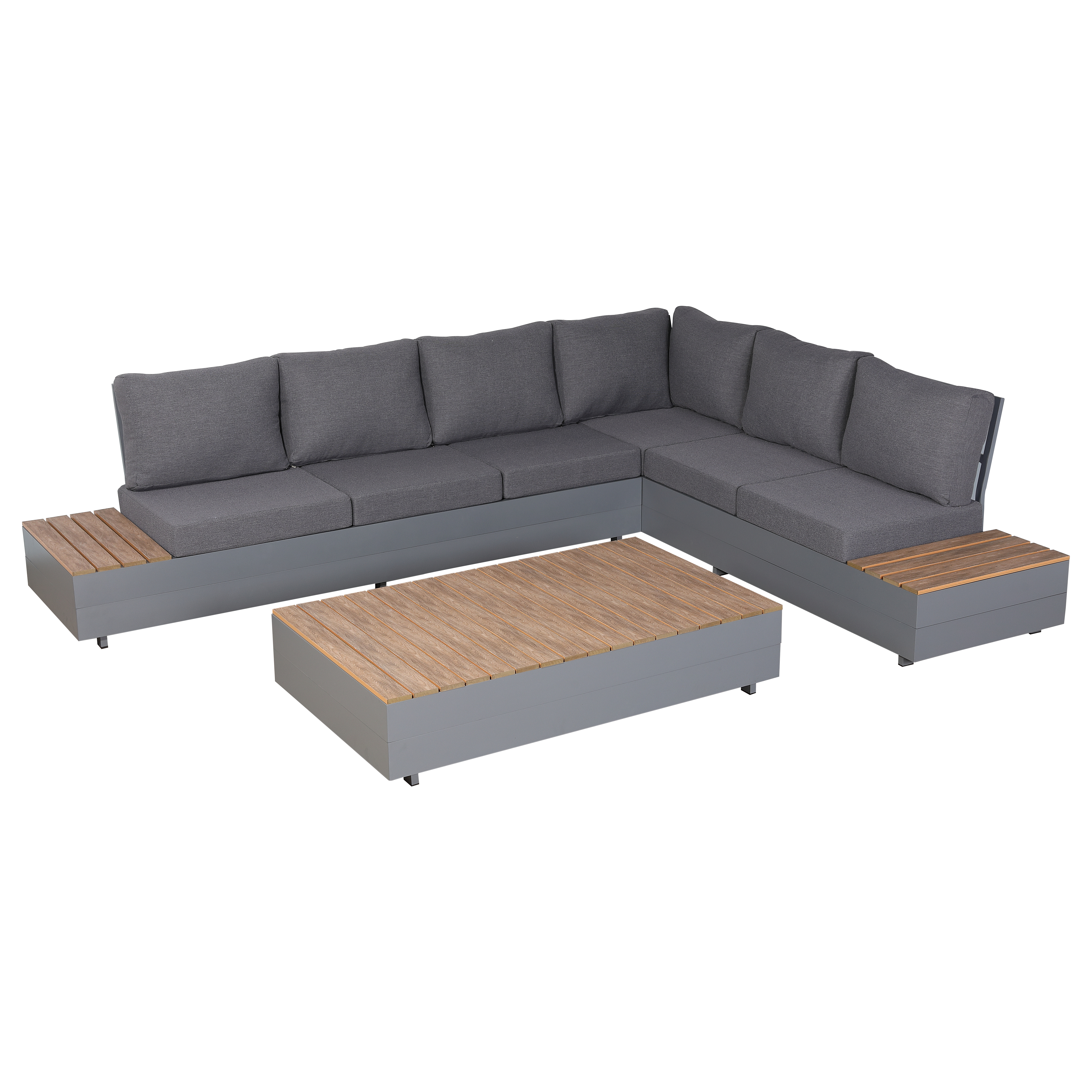 This Titan aluminum outdoor sofa set features a stylish L-shaped design with plush grey cushions, complemented by a matching coffee table with a wood-textured top. Crafted for durability and comfort, it’s perfect for transforming your patio or garden into a cozy relaxation zone, blending seamlessly with various outdoor aesthetics.