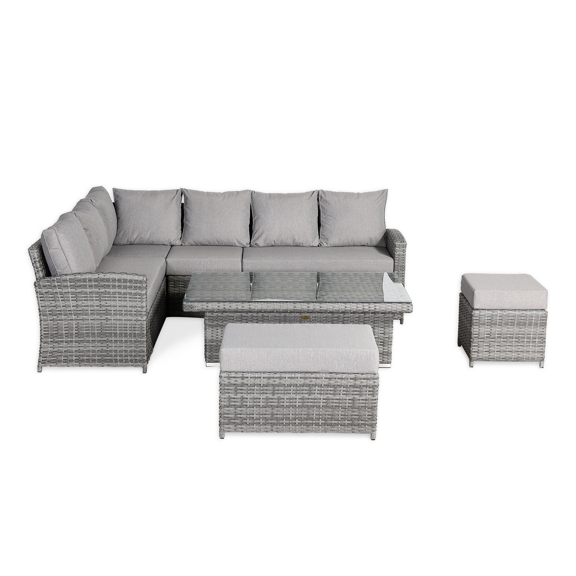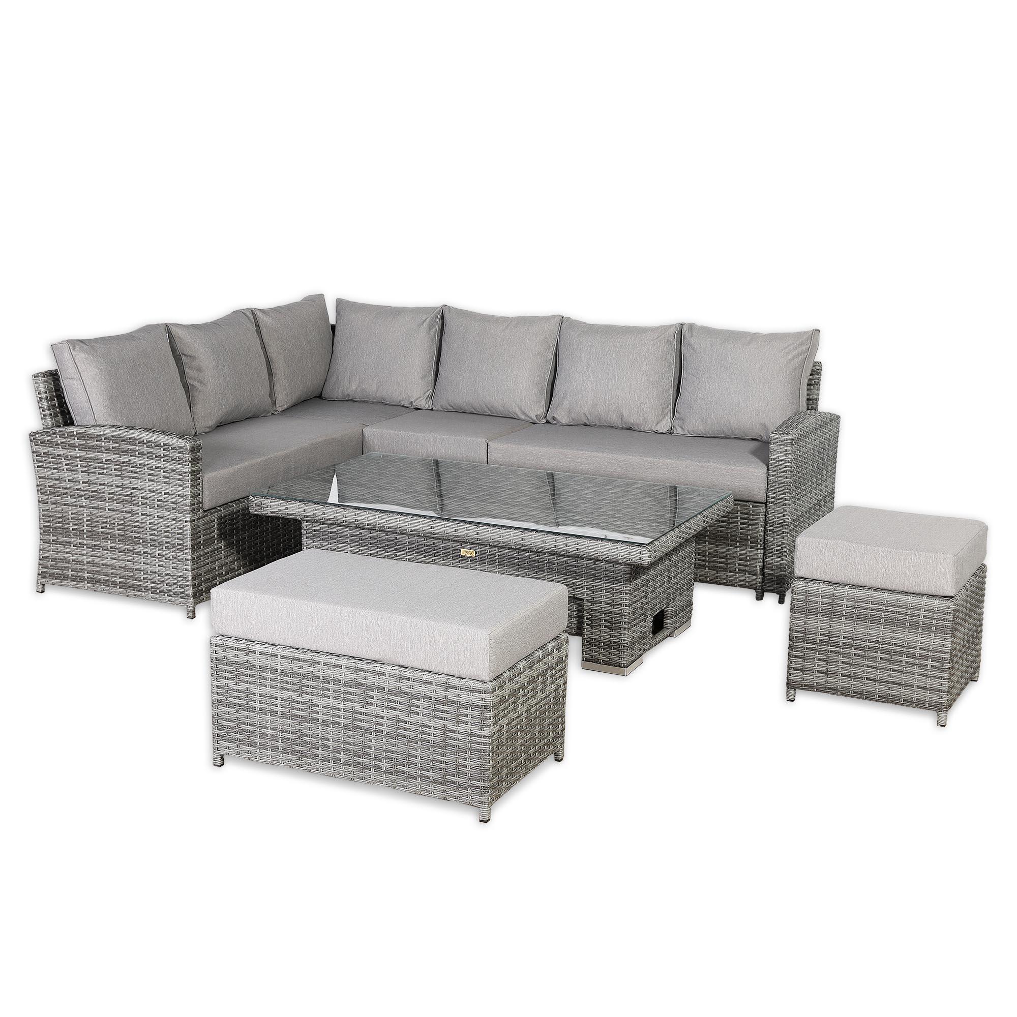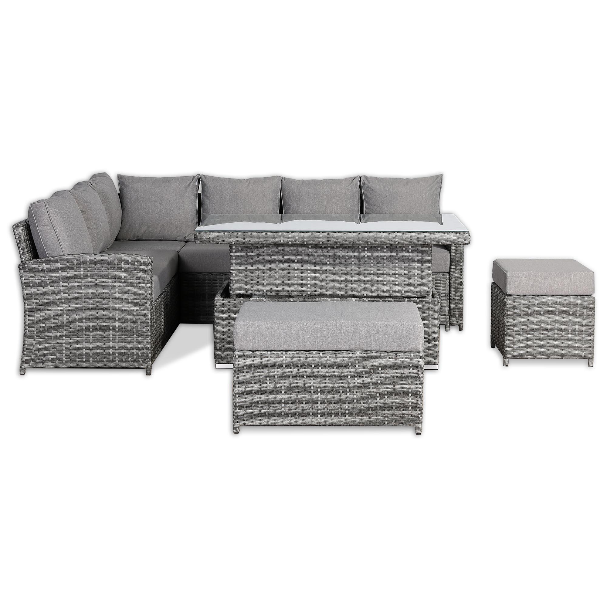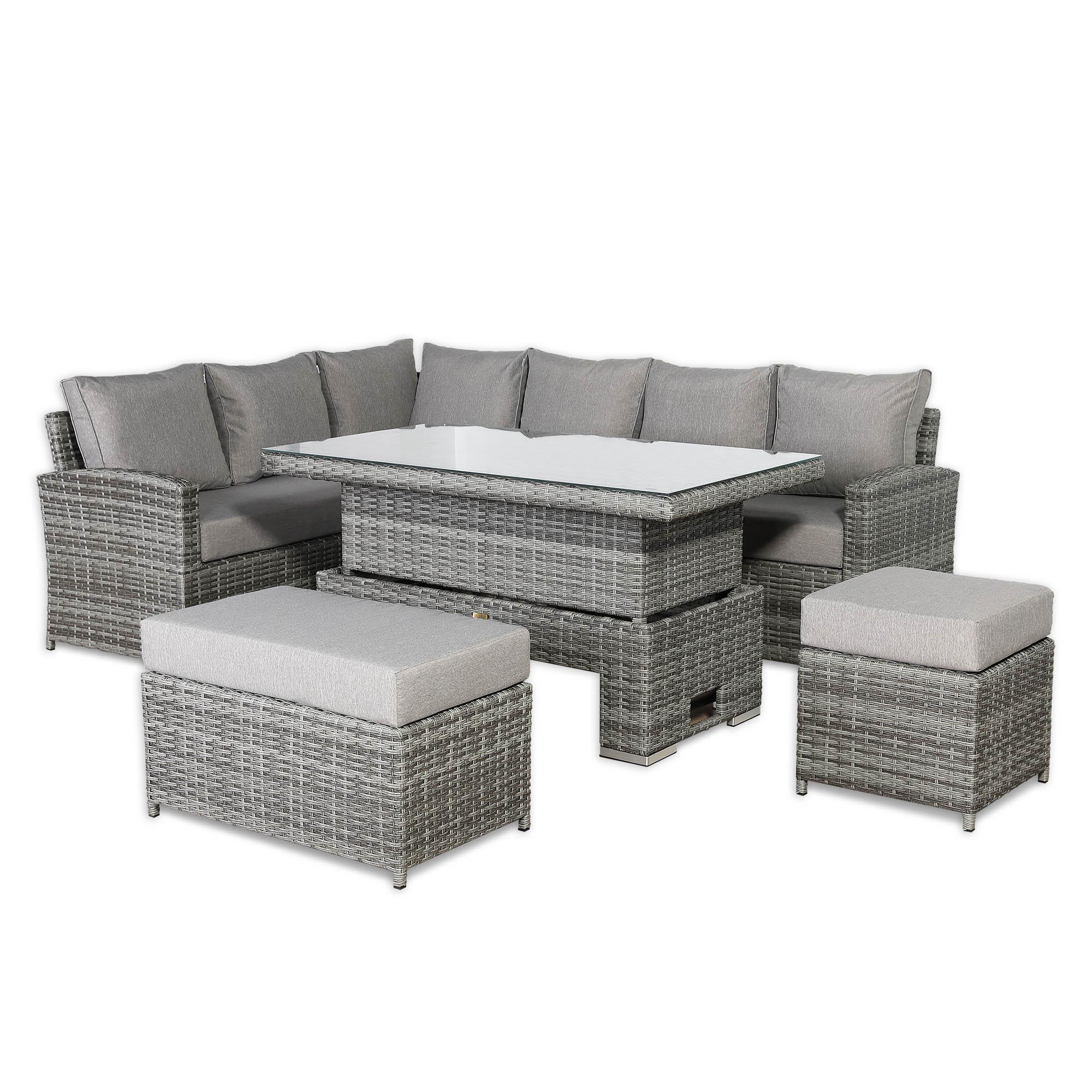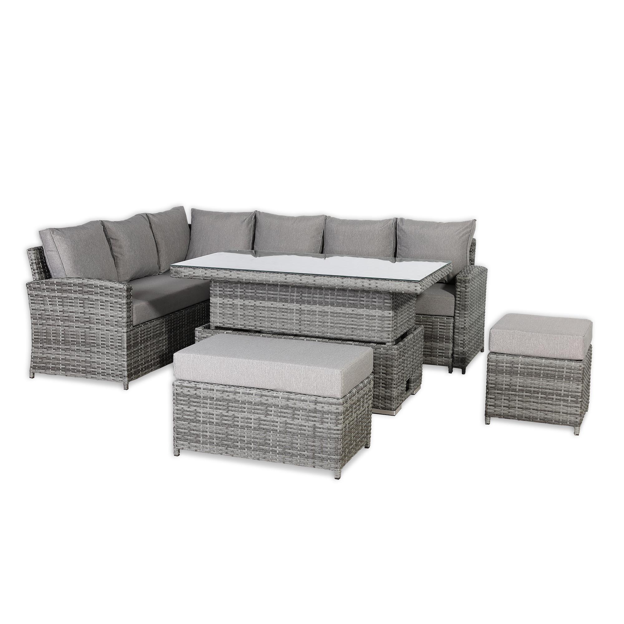 The Sloane LHF Hand Corner Sofa Set combines elegant design with durable woven craftsmanship, offering a stylish and comfortable seating solution for outdoor spaces.Enjoy the your garden in comfort either with a drink or while dining with the height adjustable table further increasing the flexibility of the set to fit all occasions.