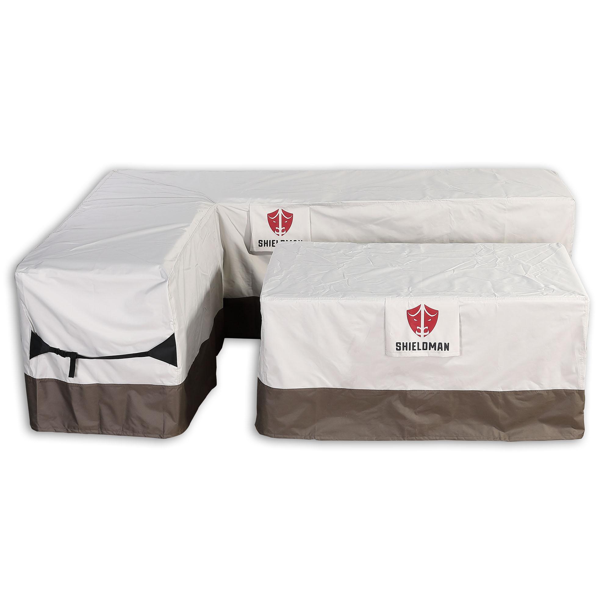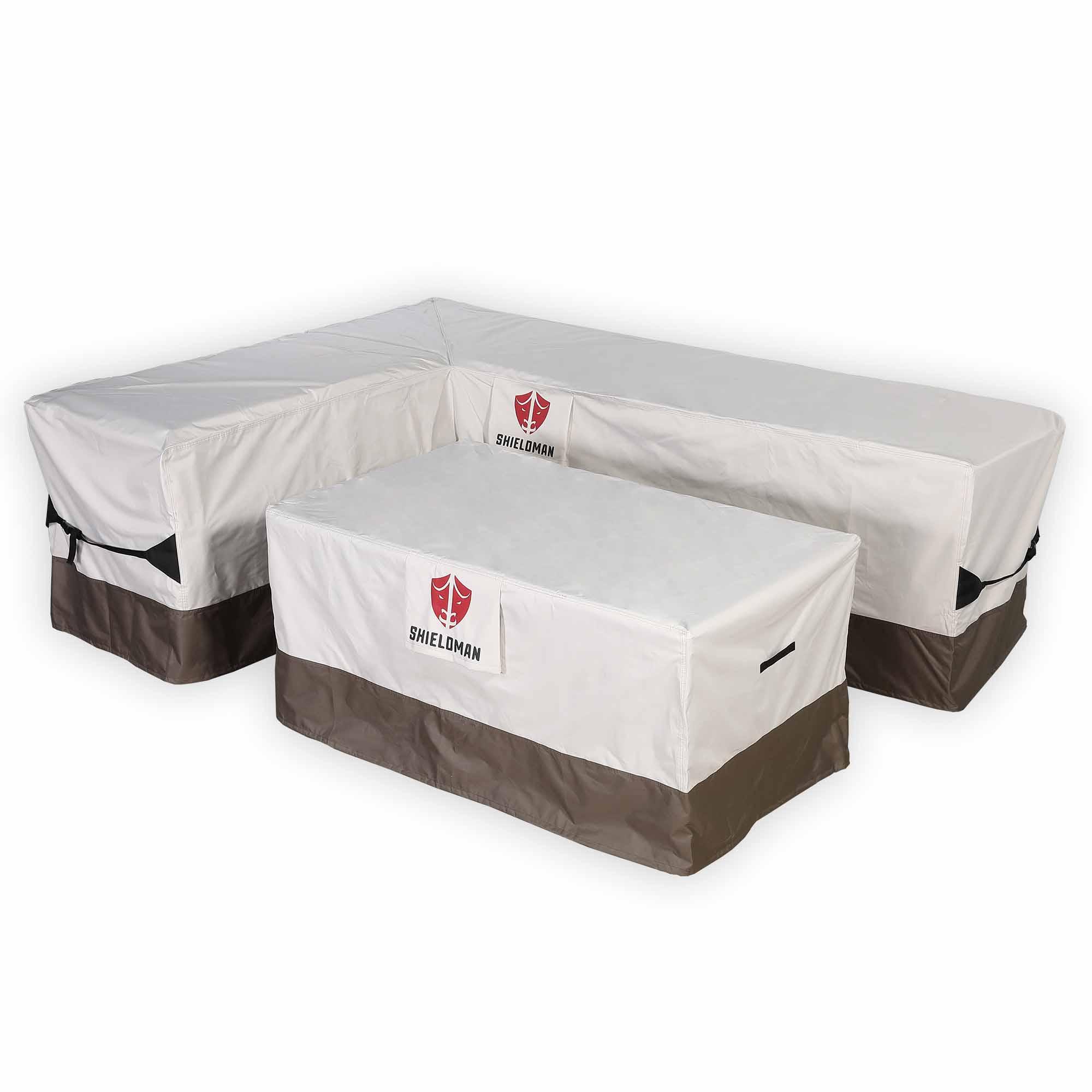 Each set comes with 2 covers to individually cover the corner sofa and the dining table. Over winter, the stools fit neatly on their side on each of the sofa sections underneath the covers.