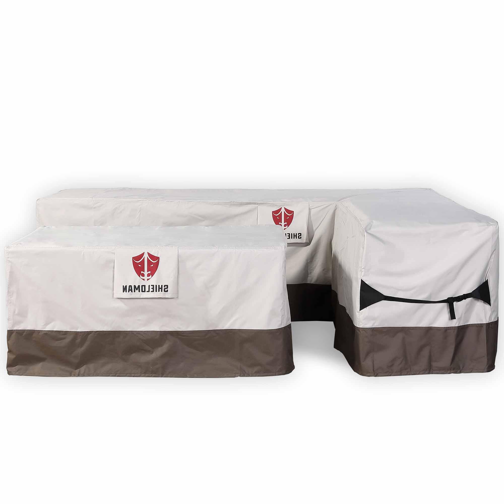 Each set comes with 2 covers to individually cover the corner sofa and the dining table. Over winter, the stools fit neatly on their side on each of the sofa sections underneath the covers.